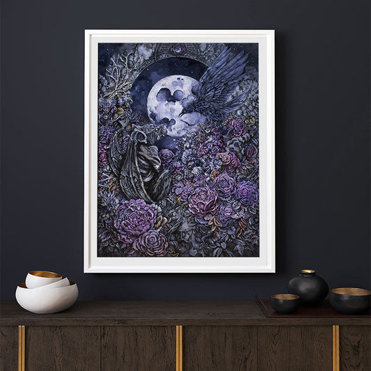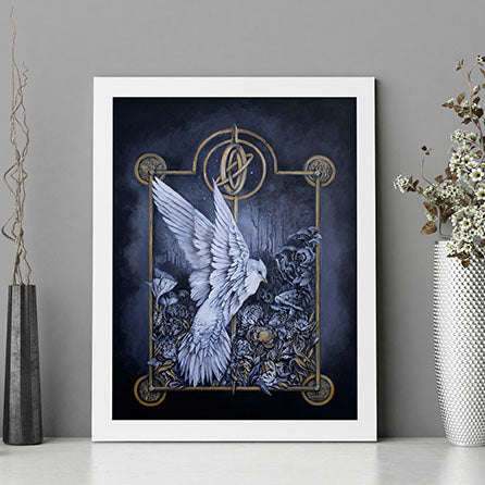 Fantasy Art Print White Bird, Mushrooms & Moon