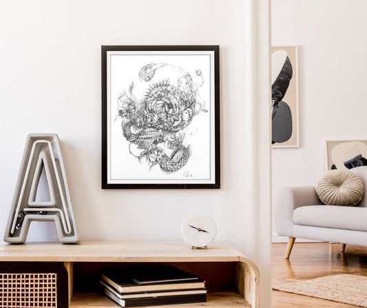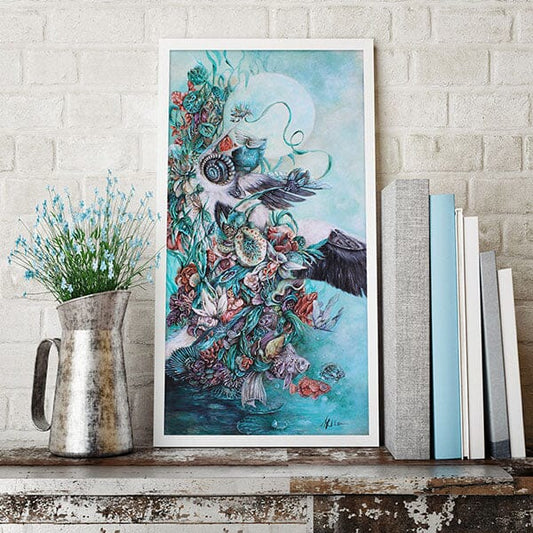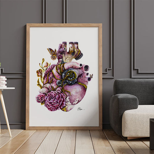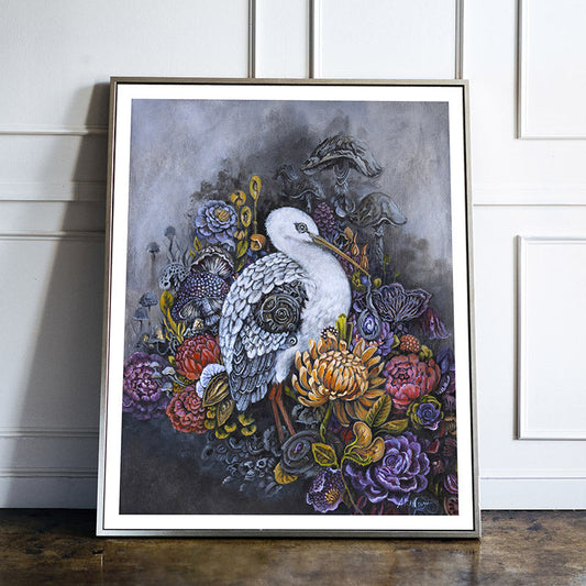 Steampunk Art Print Crane, Flowers and Mushrooms
