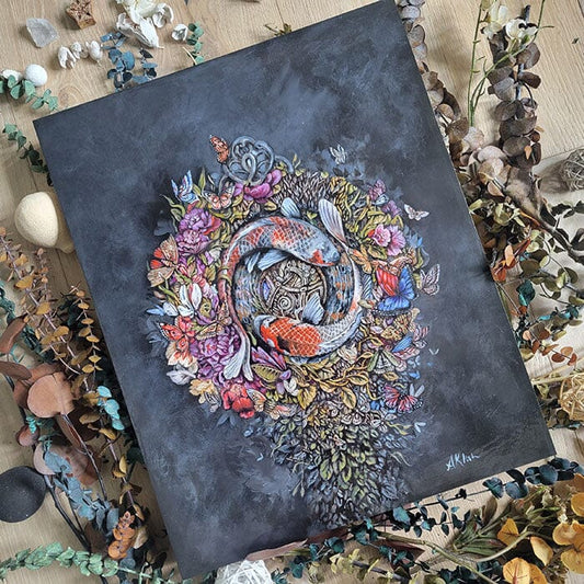 Steampunk Koi and Flowers Original Acrylic, Wood Burning Painting