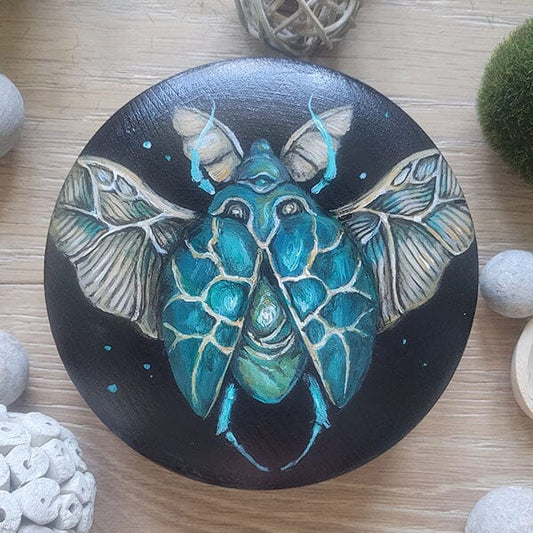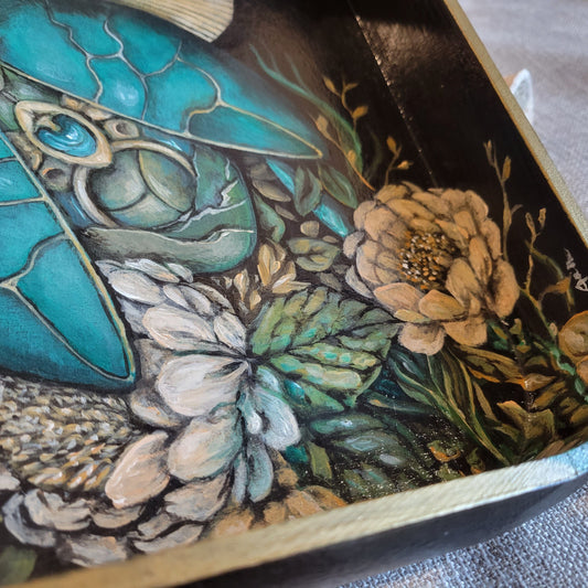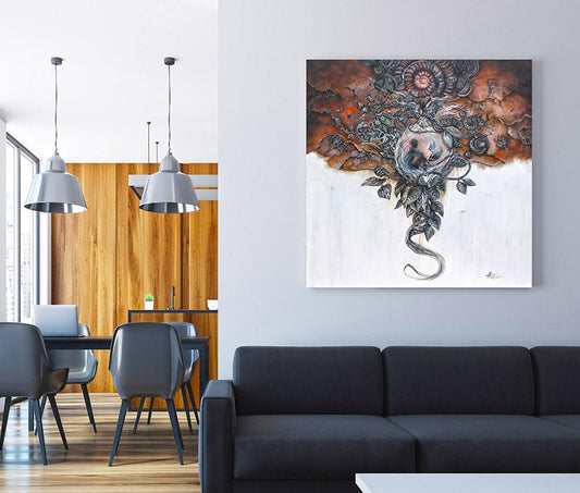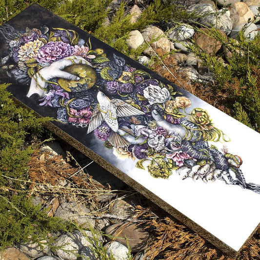 Steampunk Hands, Apple, Snake and Flowers Original Fantasy Painting with Wood Burning Art