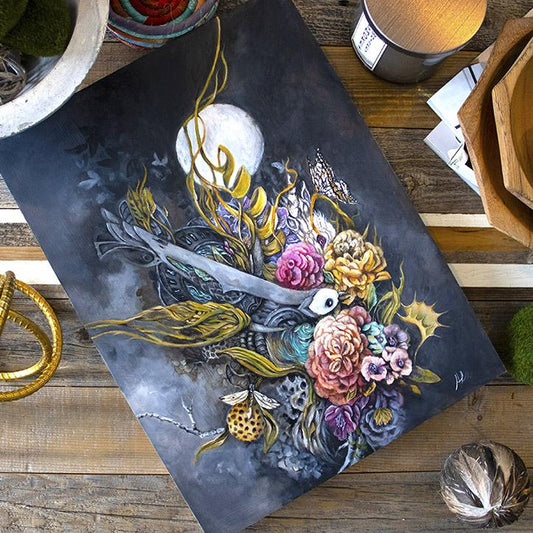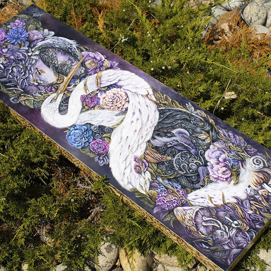 Steampunk Crane, Mushrooms and Flowers Original Fantasy Painting with Wood Burning Art