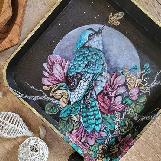 Steampunk Bird and Flowers Original Fantasy Painting with Wood Burning Art