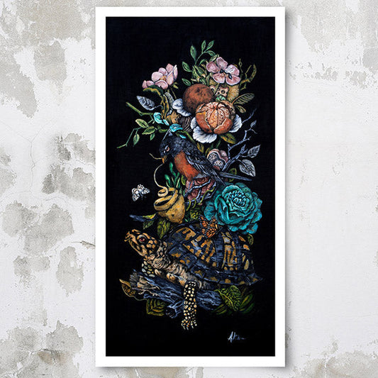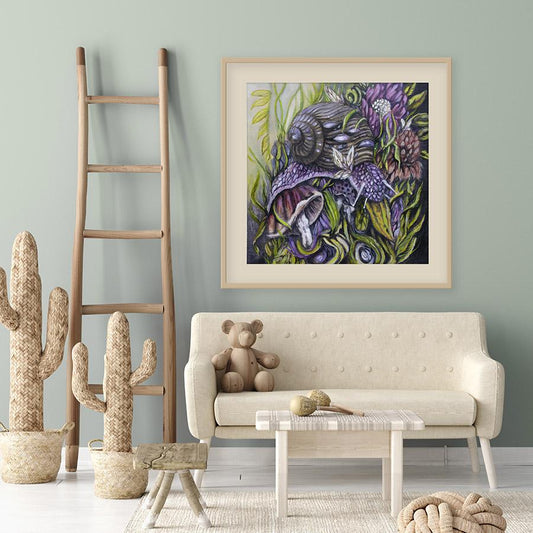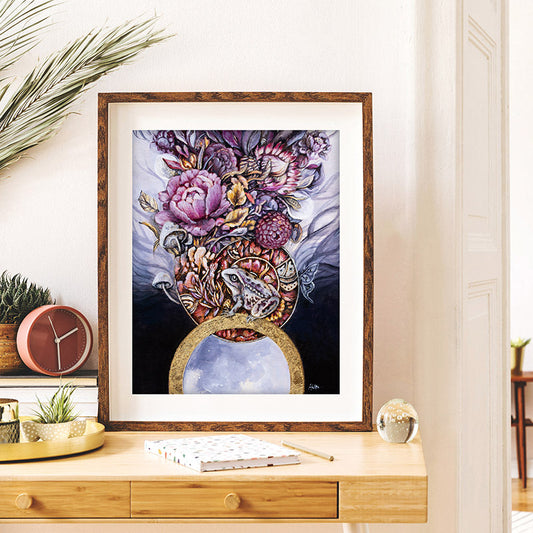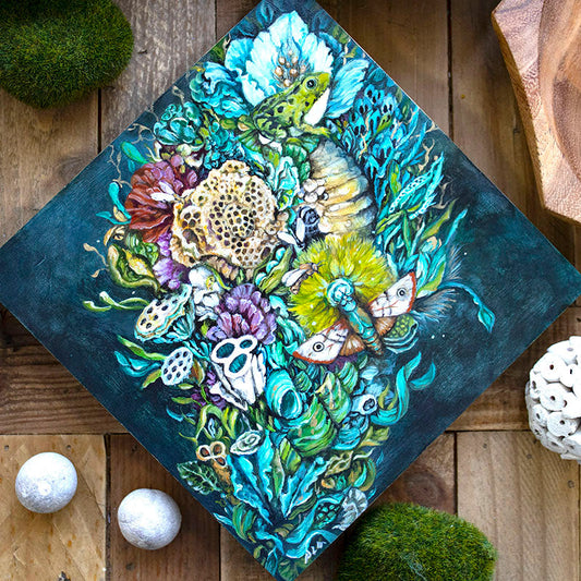 Whimsical Fantasy Art Frog, Moth, Bees and Flowers Original Painting