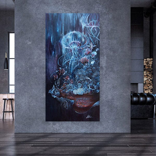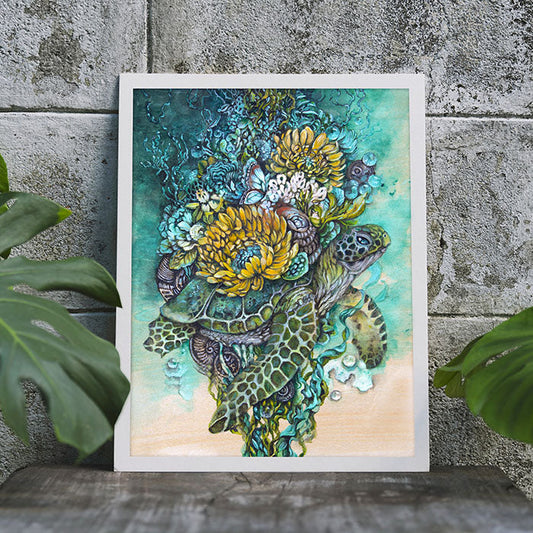 Fantasy Art Print, Sea Turtle with Yellow Flowers