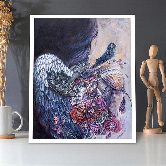 Steampunk Art Print Bunny Rabbit, Bird and Flowers