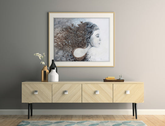 Surreal Art Woman with Leaves Butterflies and Shells Print