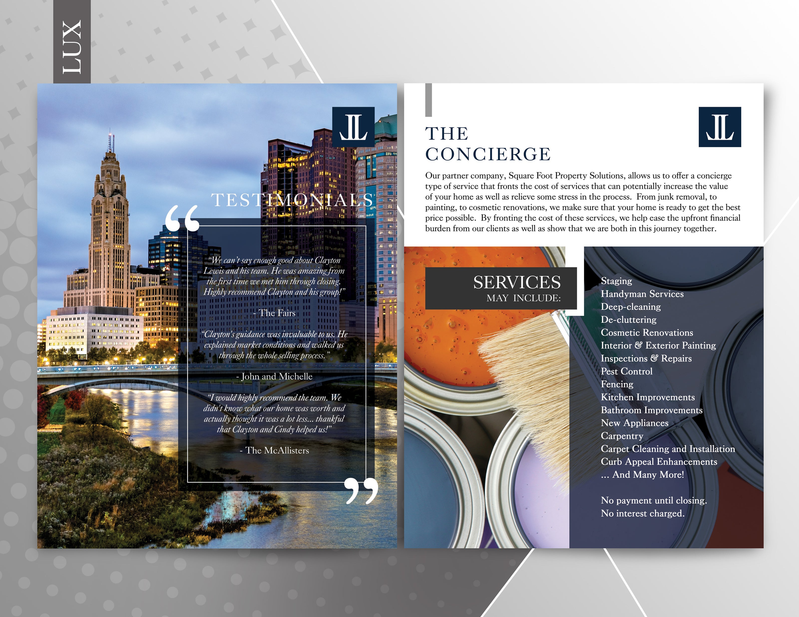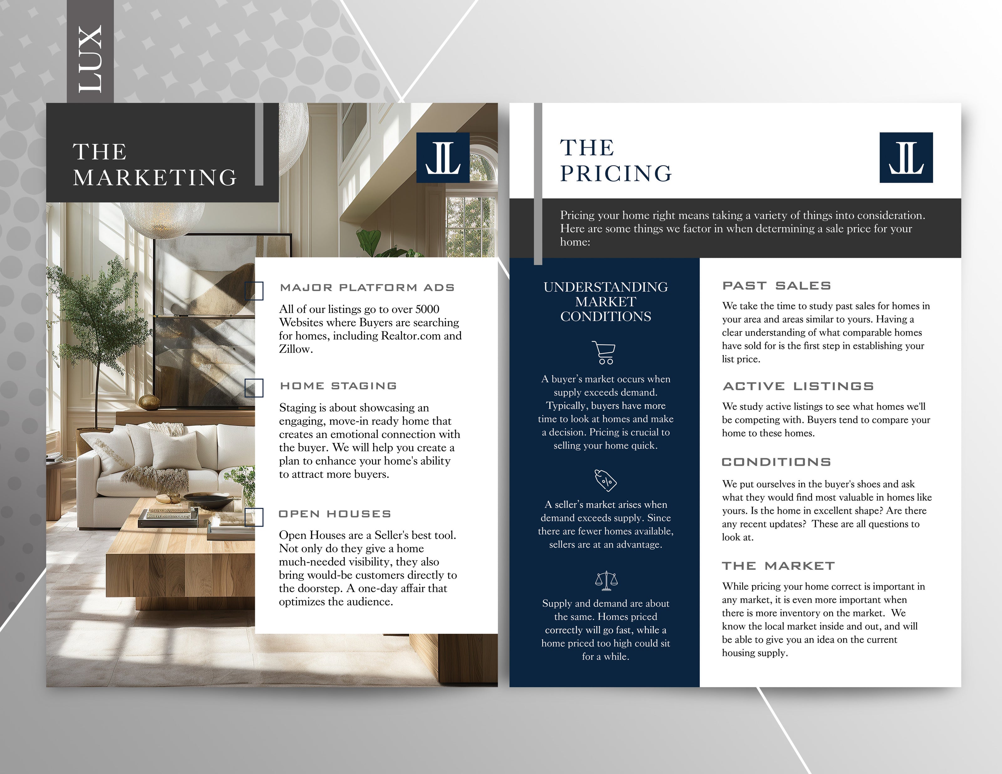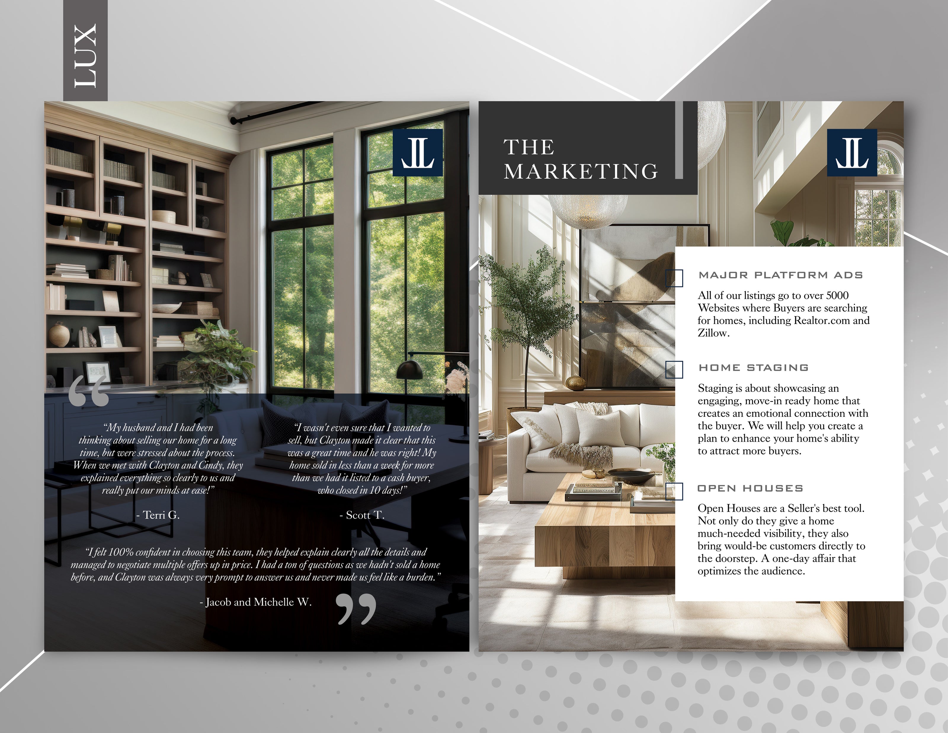 The Client requested a suite of marketing materials for print and web, featuring the new brand. The cohesive feel of the marketing is one of elegant luxury, with cool tones and clean lines. From new signage and social media graphics to presentation folders and listing brochures for new sellers, the use of muted palettes with vibrant accents carries the day and engages the viewer.