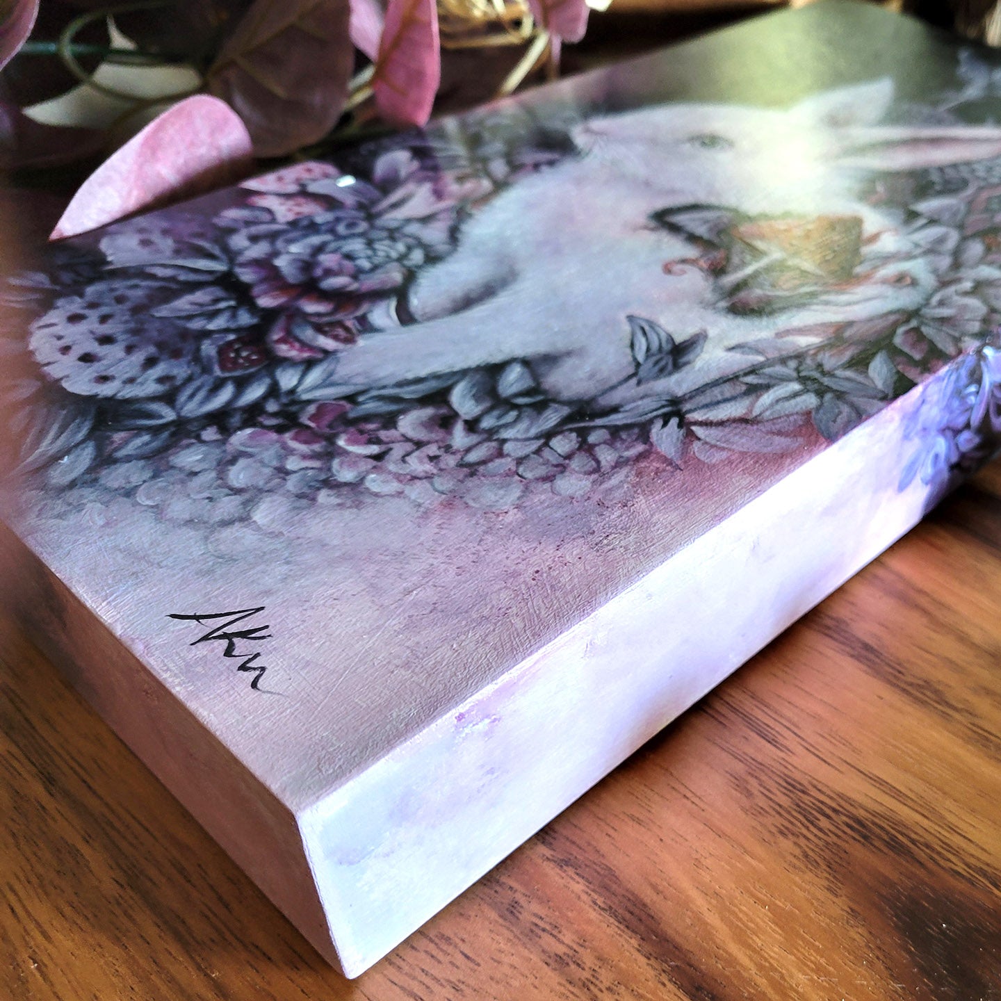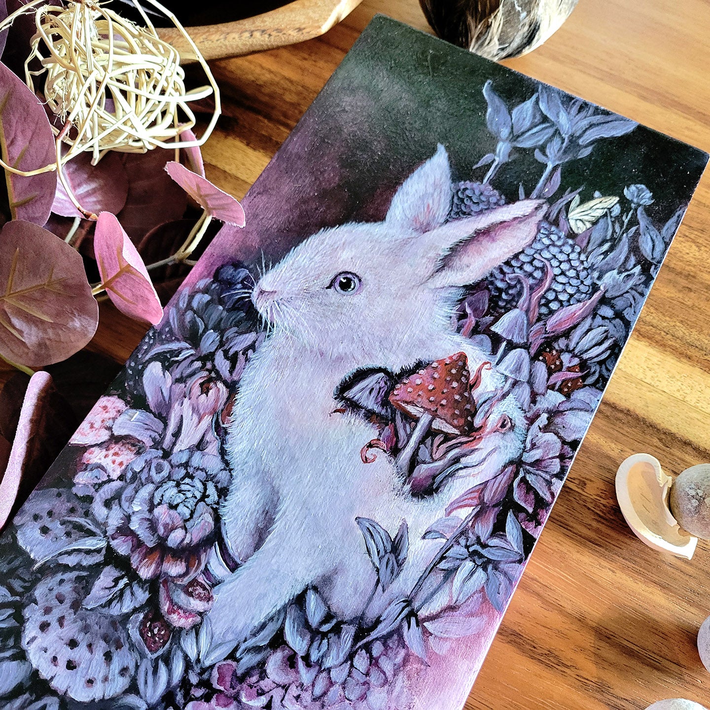 Steampunk Bunny Acrylic Painting, Original Art with Rabbit and Mushrooms - "Nestled Among" features a 6" x 12" gallery-quality wood birch panel with an acrylic painting of an adorable white bunny surrounded by mushrooms and flowers. You will fall in love with the warm shades of purple, pink, and red! The painting wraps around the piece's edges, providing a beautiful 'frame' so no additional framing is required. This adorable piece is perfect for that special wall in the nursery, or for small spaces you want to shine!